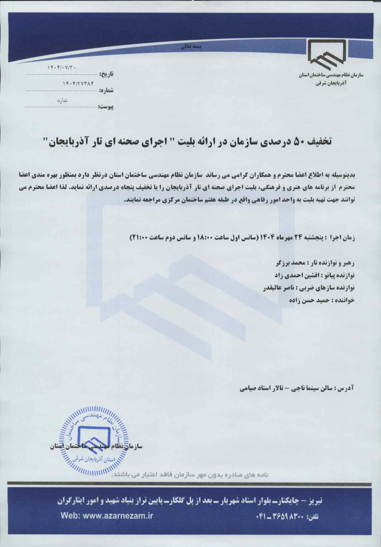 تخفیف 50 درصدی بلیط اجرای صحنه ای تار آذربایجان
