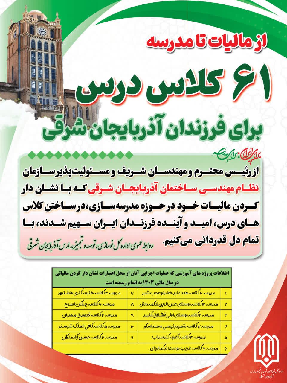 بر پایه اعلام اداره کل نوسازی مدارس آذربایجان شرقی، تاکنون ۶۱ کلاس درس جدید در نقاط مختلف استان از محل مالیاتهای نشاندارشده احداث و به مجموعه فضاهای آموزشی استان افزوده شده است.