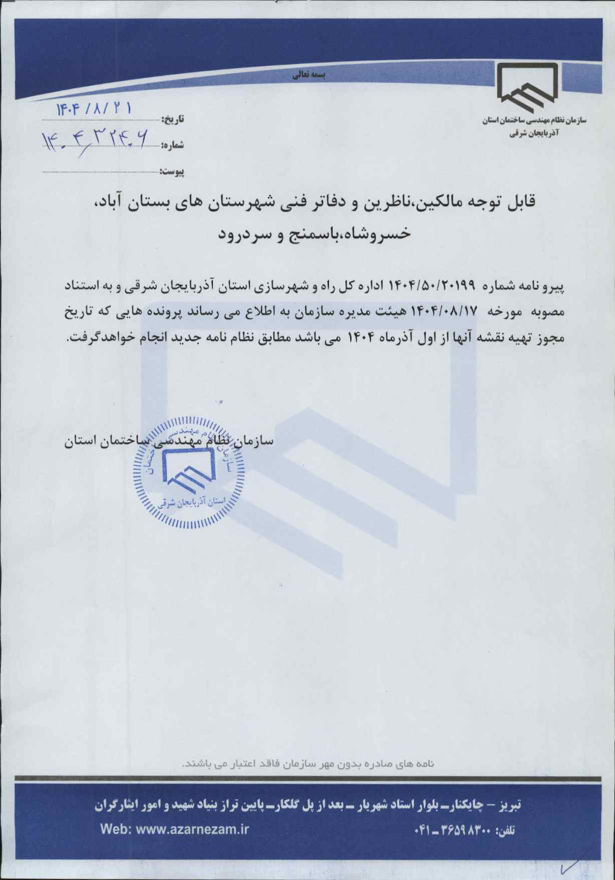 قابل توجه مالکین، ناظرین و دفاتر فنی فنی بستان آباد، خسروشاه، باسمنج و سردرود