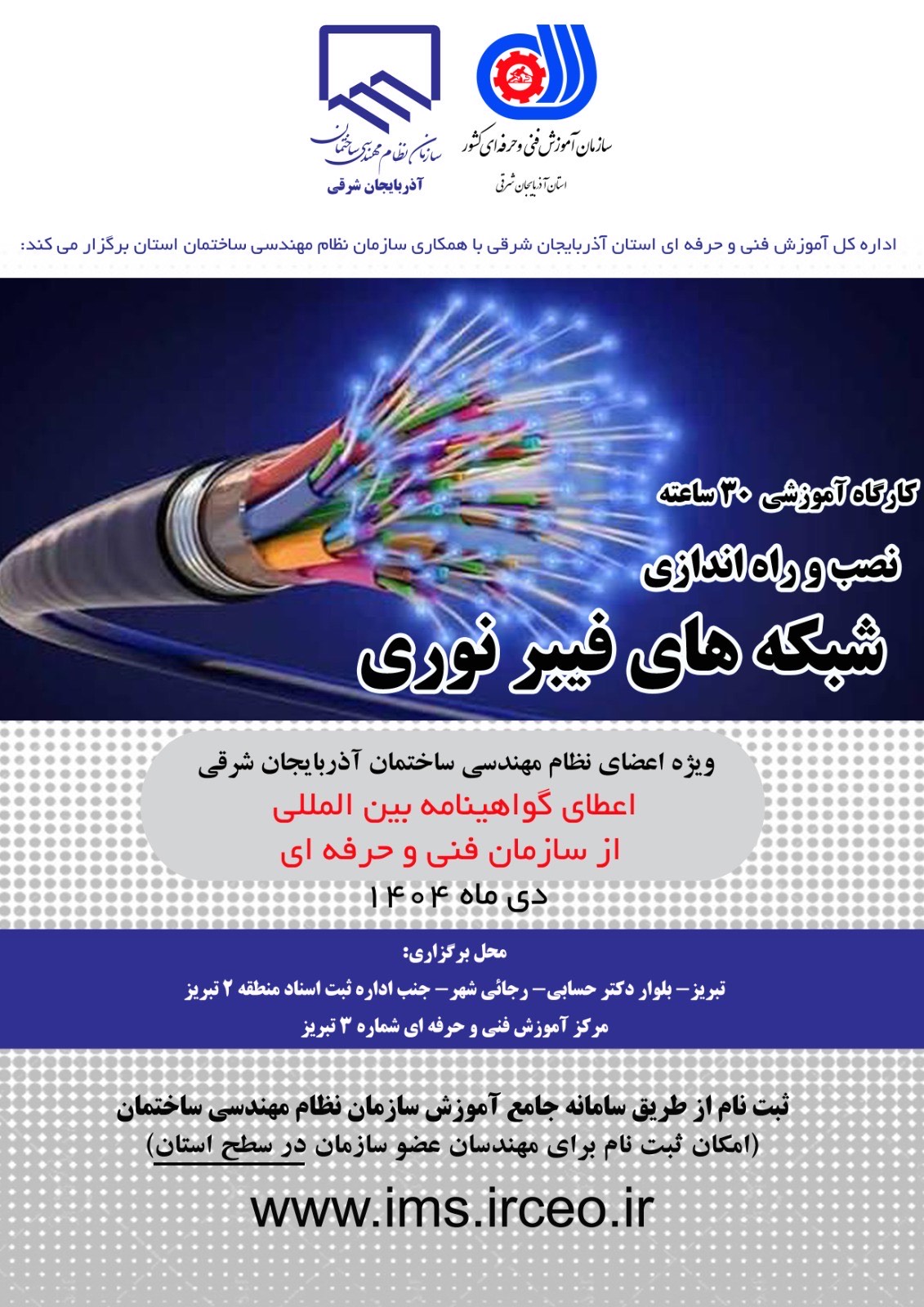 باطلاع مهندسان عضو سازمان می رساند با توجه به نیاز شرکت مخابرات استان و با هدف تربیت نیروی انسانی متخصص و توانمند برای توسعه شبکه فیبر نوری در سطح استان، کارگاه آموزشی نصب و راه اندازی شبکه های فیبر نوری توسط سازمان با همکاری اداره کل فنی و حرفه ای استان برگزار خواهد شد.