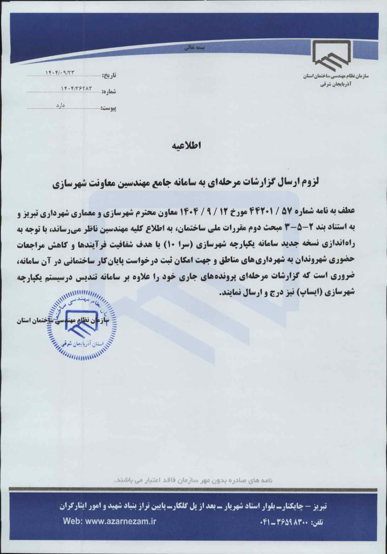 اطلاعیه لزوم ارسال گزارشات مرحله ای به سامانه جامع مهندسین معاونت شهرسازی