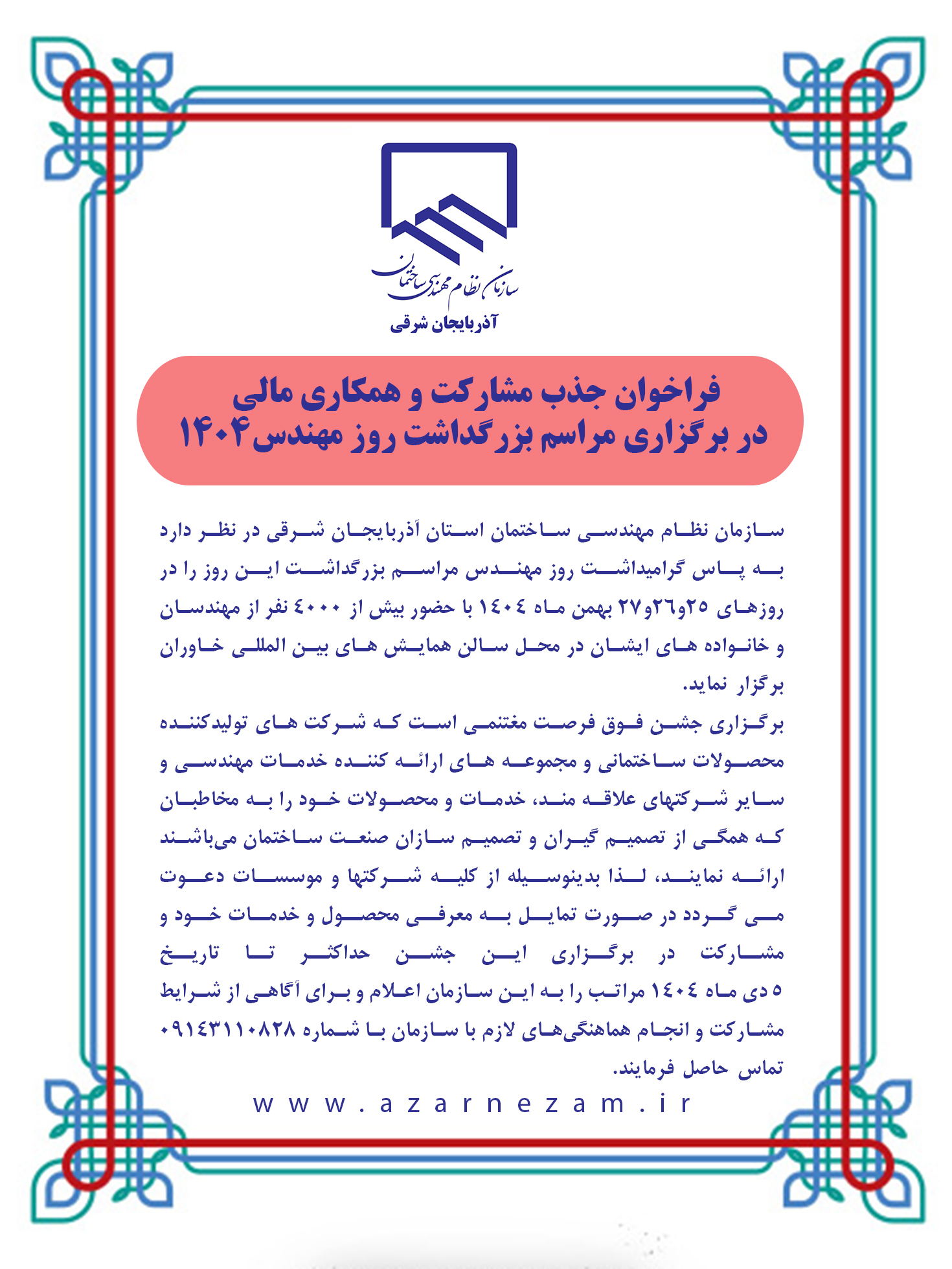فراخوان جذب مشارکت و همکاری مالی در برگزاری مراسم بزرگداشت روز مهندس1404